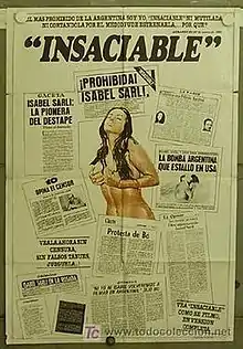 Insaciable (also known as The Insatiable Widow) is a 1976 Argentine erotic drama film written and directed by Armando Bó.[1] It stars Isabel Sarli as a "worried nymphomaniac in search of satisfaction or cure".[2] The film was highly controversial in Argentina due to its nudity and sexual content and lesbianism.[3] This was played upon with a film poster documenting extracts from the Argentine press condemning the film and documenting those calling for it to be banned or censored.