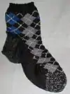 Common examples of intarsia include sweaters with large, solid-colour features like fruits, flowers, or geometric shapes. Argyle socks and sweaters are normally done in intarsia, although the thin diagonal lines are often overlaid in a later step, using Swiss darning or sometimes just a simple backstitch.