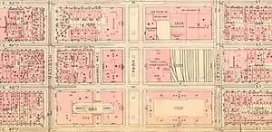 Maps from the 1920s (top) and the 1950s showing the site of The Barclay, center right