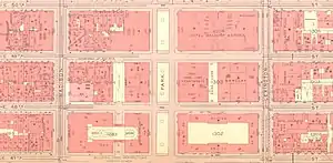 The InterContinental Barclay Hotel is at 111 East 48th Street, on the western side of Lexington Avenue between 48th and 49th Streets, in the Midtown Manhattan neighborhood of New York City.[2][3] It sits on the eastern portion of a city block bounded by Park Avenue to the west, 48th Street to the south, Lexington Avenue to the east, and 49th Street to the north.[4] The Barclay occupies a rectangular land lot with an area of 41,170 sq ft (3,825 m2).[5] The site has a frontage of 200 ft (61 m) on Lexington Avenue and 205 ft (62 m) on either side street.[5] When the Barclay was built in the 1920s, it adjoined Park Lane, a private driveway, to the west.[6][7]