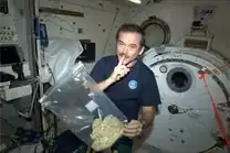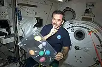 The International Space Station cannabis experiment hoax is an Internet hoax that purports to show an image of Canadian astronaut Chris Hadfield holding a large baggie of cannabis to demonstrate an experiment concerning getting high by smoking cannabis on the International Space Station. According to Snopes and other websites, the image appeared on Facebook around November 26, 2018;[1][2] Hadfield replied on Twitter to another similar hoax or possibly the same image in 2016.[3] The photograph is a doctored image of Hadfield holding a plastic zipper storage bag containing Easter eggs,[4] which Hadfield tweeted in 2013.[5] In Hadfield's 2013 autobiography An Astronaut's Guide to Life on Earth (predating the hoax), he described the bag of eggs being permanently stowed on the station for the crew during that holiday.[6]
