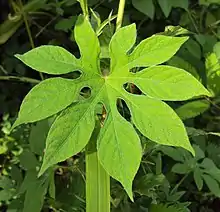 Ipomoea pes-tigridis is a hairy, vine and annual plant. It can grow up to 3–10 ft (0.91–3.05 m). The heart-shape leaves are 1–4 in (25–102 mm) long with 9-19 lobes on edge of the leaf. The flowers are 1–2 in (25–51 mm) long. The trumpet-shaped flower has five points. It can be red, pink or white color and it opens after 4 pm and its flowering period is between September and November.[2]