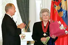 Member of the Civic Chamber of the Russian Federation (2011–2020),[20] in 2012 she entered the list of trustees of the presidential candidate Vladimir Putin.[21] In 2014, she signed the Collective Appeal of Cultural Workers of the Russian Federation in support of the policy of Russian President Vladimir Putin in Ukraine and Crimea.[22]