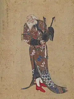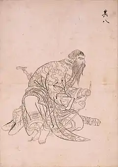 with European stockings and shoes under his fur-lined Ezo nishiki robe,[4]:100 he wears blue bead and cloth tassel earrings and holds a hoe-shaped helmet ornament[1]:121 (as does the chieftain Tobu in Kakizaki Hakyō's 1783 portrait (see Gallery below))