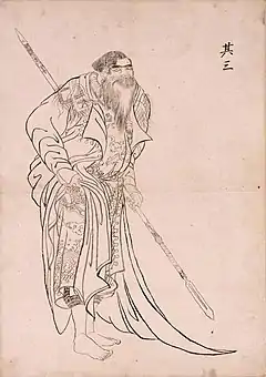 with a spear and bare-legged, he wears a Russia greatcoat over his Ezo nishiki robe[1]:121