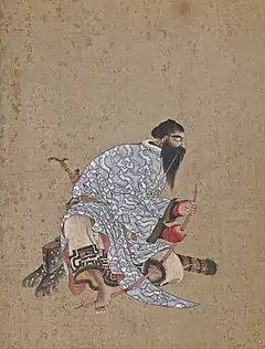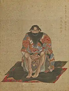 Mautarake, with a beard, unbound hair, synophrys, sanpaku eyes, large ears and nose, and a hairy body; his robe is wrapped right over left