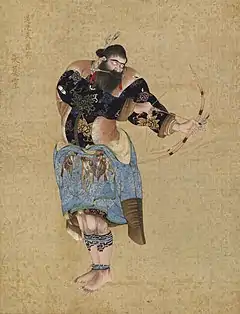 with his sanpaku eyes, he sits on bear[10]:158 or sea otter[11][1]:121 skins, his Ezo nishiki robe — with dragons, clouds, and waves, worn right over left — rides up, revealing his hairy legs; in his hands is an item of jewellery with tassels and beads[10]:158
