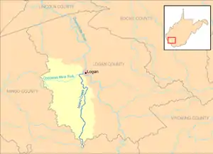 Island Creek is a tributary of the Guyandotte River, 18.1 miles (29.1 km) long,[3] in southern West Virginia in the United States. Via the Guyandotte and Ohio rivers, it is part of the watershed of the Mississippi River, draining an area of 105 square miles (270 km2)[4] in a rural area on the unglaciated portion of the Allegheny Plateau, in the Logan Coalfield. Island Creek's entire course and drainage area are in Logan County.[5]