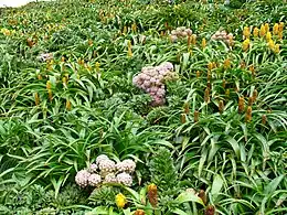 A megaherb community of Ross lilies and Cambell Island carrots exhibit yellow and pink flowers respectively to attract alternate pollinators.[2] They both exhibit insular gigantism