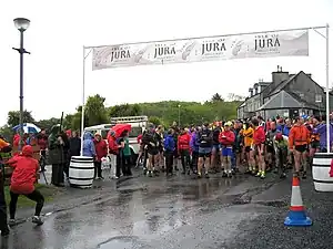 The Isle of Jura Fell Race is an annual fell race held in May, starting and finishing at Craighouse on the Scottish island of Jura. The course loops west and north over several hills including the Paps of Jura. After the last climb to Corra Bheinn, a boggy descent takes the runners down to the tarmac coastal road which is followed for the final three miles to the finish. The route is approximately 17 miles (27 km) in length, with around 2,350 metres (7,710 ft) of ascent. As well as being known for the very difficult rocky and boggy terrain involved, the race is notable for its remoteness. The journey to the start of the race typically involves a ferry journey from the Scottish mainland to Islay, followed by another ferry to Jura and then several miles by bicycle, by bus or on foot to Craighouse.[1]