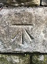 The benchmark was carved into a north facing vertical rock on the Isle of the Dead on 1 July 1841.[74][75] The standard British ordnance survey benchmark of a broad arrow was used with the horizontal line measuring 50 cm across.[76] A small stone tablet was also installed above the benchmark recording the date the benchmark was struck and the measurements used to determine its position.[77] The tablet remained until the early 20th century when it was reported missing.[78][79]