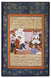 From an early age, Ismail was acquainted with the Iranian cultural legacy. When he reached Lahijan in 1494, he gifted Mirza Ali Karkiya a copy of the medieval Persian epic Shahnameh (Book of Kings) with over 300 illustrations.[66] Owing to his fondness of Iranian national legends, Ismail named three of his four sons after mythological shahs and heroes of the Shahnameh; his oldest son was named Tahmasp, after the last shah of the Pishdadian dynasty; his third son Sam after the champion of the Pishdadian shah Manuchehr and ancestor of the celebrated warrior-hero Rostam; his youngest son Bahram after the Sasanian shah Bahram V (r.420–438), famous for his romantic life and hunting feats. Ismail's expertise in Persian poetic tales such as the Shahnameh, helped him to represent himself as the heir to the Iranian model of kingship.[67] According to the modern historian Abbas Amanat, Ismail was motivated to visualize himself as a shah of the Shahnameh, possibly Kaykhosrow, the archetype of a great Iranian king, and the person who overcame the Turanian king Afrasiyab, the nemesis of Iran. From an Iranian perspective, Afrasiyab's kingdom of Turan was commonly identified with the land of the Turks, in particular with the Uzbek Khanate of Bukhara in Central Asia. After Ismail defeated the Uzbeks, his victory was portrayed in Safavid records as a victory over the mythological Turanians.[67] However, this fondness of Iranian legends was not only restricted to that of Ismail and Safavid Iran; Both Muhammad Shaybani, Selim I, and later Babur and his Mughal progeny, all associated themselves with these legends. Regardless of its increasing differences, Western, Central, and South Asia all followed a common Persianate model of culture and kingship.[68]