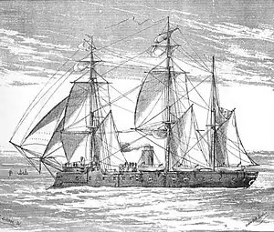 Her propulsion system consisted of one single-expansion steam engine that drove a single screw propeller. Steam was supplied by eight coal-burning, rectangular fire-tube boilers that were vented through a single funnel. Her engine produced a top speed of 12.6 knots (23.3 km/h; 14.5 mph) from 2,620 indicated horsepower (1,950 kW). She could steam for 2,600 nautical miles (4,800 km; 3,000 mi) at a speed of 10 knots (19 km/h; 12 mph). The ship was initially schooner-rigged to supplement the steam engine, though her masts were later reduced to a barque rig. Ultimately, she lost her sailing rig completely, having it replaced with a pair of military masts with fighting tops.[1]