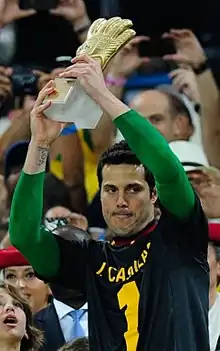 In June 2009, Júlio César was named in the Brazil squad by manager Dunga for the 2009 FIFA Confederations Cup.[132] He played his first match in the tournament on 15 June 2009 in Brazil's 4–3 defeat of Egypt.[133] His performance was rated as positive whatsoever.[134] Júlio César, however, kept clean-sheets in the remaining two matches of Group B as Brazil finished on top with full points.[135][136] Brazil defeated South Africa in the semi-final, with Júlio César giving a Man of the Match performance.[137] In the final on 28 June against the United States, Júlio César won his second international trophy after Brazil won 3–2 despite conceding twice in the first half.[138] Individually, he was the keeper with most clean-sheets in the tournament, 3 in 5 matches.