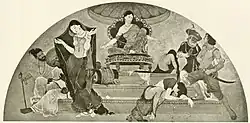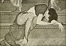Ahivasi was a part of the group which had executed this project.[10] He was given the task of creating murals for two lunettes on the dome of the room. The two artworks that he designed were Painting and Drama. Painting is based on the Rajput miniature style with a modern approach of subject handling and composition. Whereas, Drama has a touch of Western realistic style with a dramatic figure composition. Two contrasting emotions are depicted on the either side of a woman who is seated on the throne in the center.[11] These paintings were created in oils on canvas and later attached to the walls of the room. The final work began from the month of November 1928 and was completed in August 1929.[9]