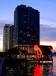 Water taxi service in Downtown Jacksonville began in 1987, with the opening of the Jacksonville Landing, a riverfront shopping and entertainment center.[3] In the early years, a variety of companies ran water taxis out of the Landing, with the City of Jacksonville allowing any operator who passed the minimum U.S. Coast Guard safety regulations to start a water taxi business. This led to fierce competition during peak times and inconsistent service, with captains ignoring city regulations on routes and use of the stops to fight each other for customers. Eventually, the Jacksonville City Council Waterways Commission stepped in to demand improved service. Ultimately, in 2002, the City of Jacksonville adopted new regulations governing the Jacksonville Water Taxi, awarding a contract to a single operator who adheres to a consistent route and schedule.[4]