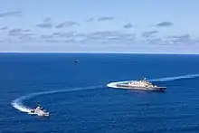 The USS Milwaukee (LCS-5) (right) with Jamaican Coast Guard ship HMJS Alexander Bustamante (left) conduct joint exercises supporting counter-illicit drug trafficking operations in 2022