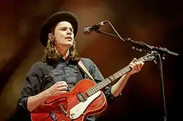 Bay endorses and plays Tone King amplifiers, a boutique amplifier brand of Premier Builders Guild.[36] In 2017, he released his Epiphone Signature "1966" Century Outfit, an accurate recreation of his customized 1966 Epiphone Century guitar which has James Bay's "Hat Man" logo on the headstock and custom strap.[37]