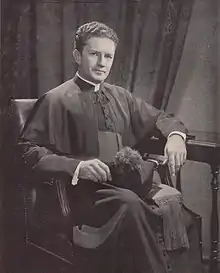 When he was 33 years old and serving as head of the colleges' department of philosophy, he was appointed by Bishop (later Archbishop) Thomas J. Walsh of Newark to serve as president of Seton Hall College in July 1936, making him the nation's youngest college president.[3] When he took office, he led a liberal arts school that had an enrollment of 300.[4] During his tenure, he oversaw the admission of women and the construction of the Walsh Gymnasium, as part of a project initiated in 1939 that would cost $600,000 (equivalent to $12.6 million in 2022).[5] He was named as a monsignor by Pope Pius XII in 1941, making him the youngest priest in the Newark Archdiocese to be recognized with that designation.[6]