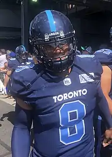 On December 12, 2017, Franklin was traded by the Eskimos (along with a 2018 third round pick) to the Toronto Argonauts in exchange for national offensive lineman Mason Woods.[13] Franklin was a pending free agent and needed to be re-signed by the Argos prior to February 13, 2018; which the Argos accomplished on January 5, 2018 when they signed him to a two-year deal.[14] Franklin was brought in by the Argos to be an understudy to veteran quarterback Ricky Ray for his final season, before taking the reins in 2019: However, Ray suffered a spinal injury in Week 2, ending his season (and possibly his career), accelerating the Argos timeline with Franklin making him the starting quarterback in Week 3.[15] Nevertheless, after a poor performance in Week 7 Franklin was demoted to backup quarterback behind McLeod Bethel-Thompson.[16] Bethel-Thompson won his first two starts, but was ultimately unable to lead the Argos to the playoffs, and with the team eliminated Franklin returned to the starting role in Week 18.[17] Both quarterbacks finished with the same starting record of 2-6 as the Argos limped to a 4-14 last place finish. As a short yardage quarterback, Franklin tied a CFL record held by Doug Flutie of most rushing touchdowns in a season, with 14.