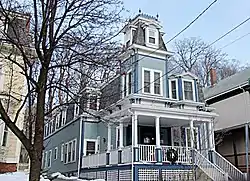 The James H. Brooks House stands in a residential area of the city's Prospect Hill neighborhood, on the north side of Columbus Avenue. It is west of the main access to Prospect Hill Park, and its rear property line abuts the park. Set on a narrow lot, it is a 1+12-story wood-frame structure, with a mansard roof and clapboarded exterior. Its roof pierced by dormers, including an elaborate projecting dormer on the right side of the front facade. It has a tower rising three stories on the left side; it is topped by a steep mansard-style roof, also with gable dormers, that is surmounted by an iron crested railing. The first floor porch is supported by turned pillars on tall square piers, with paired brackets in the eaves.[2]