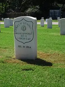 He was later killed in action during the war, and his remains were eventually buried in the Memphis National Cemetery, Memphis, Tennessee, where they can be found in Section H, Grave 4131. His gravesite is marked with a government issue Medal of Honor marker.[1]