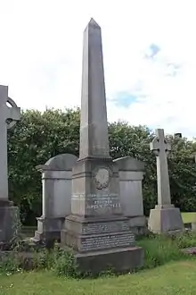 He died on 13 November 1893 at his residence, Florentine Bank, Hillhead, Glasgow, and was buried on 16 November in the Glasgow Necropolis.[1] The grave lies east of the summit.