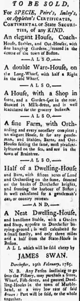 Notice from Swan about property for sale in the Boston area (Contintental Journal, 1785)
