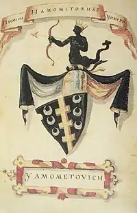 In the Korjenić-Neorić Armorial (1595), signed as Yamometovich, their coat of arms had a shield with black color, party per pale by a golden pale with three pieces on each side. In each part were three upward silver crescent Moons placed on the top of each other. On the helmet was a crowned black Triton who with the bow is shooting a golden arrow. The helmet's mantle is black-golden.[1] It was again included in the Fojnica Armorial (17th century), but instead of a Triton, the helmet has a pair of white wings in the middle of which is a golden crescent Moon.[4] The Sarak armorial (1746), signed as Xamometoevich,[4] and Bojničić's Siebmachers Wappenbuch: Der Adel von Kroatien und Slavonien (1899), had the same style of the coat of arms like in Korjenić-Neorić armorial.[5]
