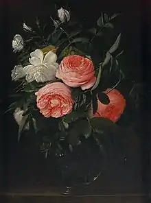 He also painted still lifes of flowers in vases such as the Glass with roses in the Kunsthistorisches Museum. He also painted the Flower still life in a stone niche (Auctioned at Hampel Fine Art Auctions on 5 December 2008, Vienna, lot 263), which follows the early 17th century model of the presentation of a flower vase in a niche.[9]