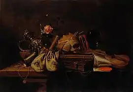 Gillemans also painted vanitas still lifes, a genre of still lifes which offers a reflection on the meaninglessness of earthly life and the transient nature of all earthly goods and pursuits. An example is the composition Vanitas still life (Hermitage Museum).[12] This composition contains the typical symbolism of vanitas paintings: a crowned skull, a wilting flower, an hourglass, an empty glass and cup, and a book and money bags (symbolising the futility of mankind's higher and worldly aspirations). On a scroll of paper are written the words 'Omnia Vanitas', which refer to the famous line of the Ecclesiastes, which in the Latin version of the bible called the Vulgate 1:2; 12:8 is rendered as Vanitas vanitatum omnia vanitas. In the King James Version it is translated "Vanity of vanities, all is vanity".[12][13][14] This is one of the principal themes of vanitas paintings.