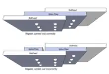 - The subsequent repair of the bulkhead did not conform to Boeing's approved repair methods. For reinforcing a damaged bulkhead, Boeing's repair procedure calls for one continuous splice plate with three rows of rivets.[25] The Boeing repair technicians, however, had used two splice plates parallel to the stress crack.[26][3] Cutting the plate in this manner negated the effectiveness of one of the rows of rivets, reducing the part's resistance to fatigue cracking to about 70% of that for a correct repair. The post-repair inspection by JAL did not discover the defect, as it was covered by overlapping plates.[2][3][27] During the investigation, the Accident Investigation Commission calculated that this incorrect installation would fail after about 11,000 pressurization cycles; the aircraft accomplished 12,318 successful flights from the time that the faulty repair was made to when the crash happened.[2]: 101–05