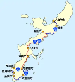 National Route 329 is a national highway of Japan connecting Nago, Okinawa and Naha, Okinawa in Japan, with a total length of 78.5 km (48.78 mi). The highway forks in Higashionna where the old 329 goes around the cliffs and the Ishikawa By-pass goes through the cliffs via the Ishikawa Tunnel (石川トンネル) and a bridge, all built in the early 1990s.