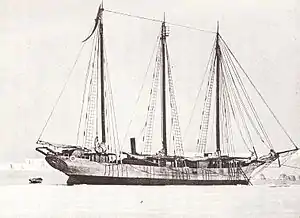 Among the personnel selected were two Ainu people from the far northern Japanese islands, chosen for their skills with dogs and sledges.[8] Dogs would be the prime mode of transport in the Antarctic; Shirase's initial preference for Manchurian ponies was impractical, since the expedition's ship, acquired with the assistance of Okuna, was too small to carry horses.[10] This ship was the Hoko Maru, a former fishing industry service boat.[5] At 30.48 m (100 ft) in length and registering 204 GRT,[19] she was much smaller than the other Antarctic ships of the era – less than a third the size of Robert Falcon Scott's Terra Nova.[8][20] But she was strongly built, with a double layer hull sheathed with iron plating, and extra protection at the stem. She was rigged as a barquentine,[19] and her sailing power was augmented by a small (18 horsepower) auxiliary engine.[10] At the suggestion of Admiral Togo, she was renamed Kainan Maru, meaning "Opener-up of the South",[2] or "Southern Pioneer".[10] The ship was placed under the command of an experienced seafarer, Captain Naokichi Nomura.[21]