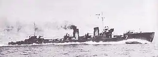 Early in the war, the No. 4 gun and the aft torpedo tubes were removed in exchange for four depth charge throwers and 18 depth charges. In addition 10 license-built 25 mm (0.98 in) Type 96 light AA guns were installed.[5] These changes increased their displacement to 1,499 long tons (1,523 t). Survivors had their light AA armament augmented to be between thirteen and twenty 25 mm guns and four 13.2 mm (0.5 in) Type 93 anti-aircraft machineguns by June 1944. These changes reduced their speed to 35 knots (65 km/h; 40 mph).[4]