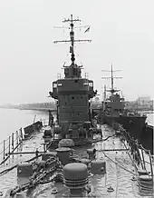 Dan Yang served as flagship of the Republic of China Navy.[11] It was an unarmed training vessel until 1952. In 1953, it was fitted with Type 89 12.7 cm/40 dual mounted guns, in addition to the Type 98 10cm/65 dual mounted guns already in use. In 1956, Dan Yang had all the Japanese armaments removed and replaced with three open air mounted 5"/38 caliber guns, 3"/50 caliber guns replaced the torpedo tubes, Bofors 40 mm guns, and newer depth charge launchers. The Republic of China Navy had no use for the original torpedo tubes as they did not have access to the appropriate armaments.