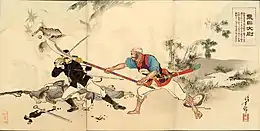 A Japanese triptych woodblock print depicting a native fighter attacking a Japanese officer with a halberd.[31]