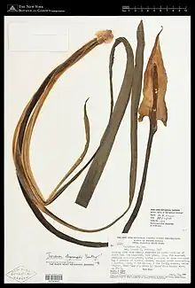 Jasarum is a monotypic genus of flowering plants in the family Araceae.[1] The single species that makes up the genus is Jasarum steyermarkii. It was discovered in 1960, but wasn't described until 1977 due to classification difficulties with regards to understanding this species. Jasarum is now believed to be closely related to Caladium and it may have evolved from Caladiums that once grew in seasonal swamps.[2] Jasarum steyermarkii is an aquatic species that is native to two river systems in Venezuela and Guyana. It is found growing in acidic blackwater and is unique in that it is the only submerged aquatic species in Araceae endemic to South America. Jasarum steyermarkii has thin ribbon-like leaves that can grow to lengths as long as 30 cm. Running down the length of the leaf is a clear midrib that has veins moving at right angles to the edge of the leaf. The spathes produced open above the surface of the water and are about 15 cm long.