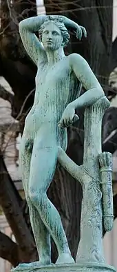 Born at Amplepuis in the département of the Rhône, the son of a decorative plasterworker of Italian origin, Vietty worked in the ateliers of the painter Pierre Cogell, then of the sculptor and medallist Pierre Cartellier and the neoclassical sculptor Joseph Chinard. Vietty was placed in command of the sculptures being executed for the stock exchange of Saint Petersburg. At the Salon of 1822 he showed a plaster of the Nymphe de la Seine. At the Salon of 1824 he received the médaille d’or for a Homère méditant l’Iliade, His bronze version of the Medici Apollino in Florence is a fountain figure in the garden of the Musée des Beaux-Arts of Lyon (illustration).