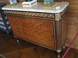 Jean-François Leleu (1729–1807) was a leading French furniture-maker (ébéniste) of the eighteenth century who was trained alongside[1] his rival Jean-Henri Riesener, in the workshop of Jean-François Oeben (1721-1763). After his master's death, he became the workshop's lead and became a master ébéniste in 1764. Leleu had the patronage of wealthy aristocrats, including the Prince de Condé, Louis-Joseph de Bourbon. His furniture was known for its high quality, elegance, and restraint, with inlays of diamonds, roses, or floral bouquets. When working for marchands-merciers, he also used inlays of Sèvres porcelain and lacquer. Leleu's clients included the Prince de Condé and Madame du Barry.