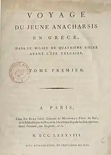 - ↑ Michaud, L. G.; Michaud, J. Fr., eds. (1843). "Barthélemy, Jean-Jacques". Biographie universelle, ancienne et moderne. Vol. tome III (nouvelle ed.). Paris: A. T. Desplaces. pp. 179–181.