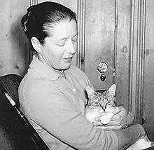 In 1943, one of Holzworth's favorite cats died of panleukopenia, a viral infection for which no vaccine was then available, prompting a renewal of her childhood interest in veterinary medicine.[2][3][15] She took time off teaching to work as a ward attendant at the Speyer Memorial Animal Hospital in New York City, before entering the College of Veterinary Medicine at Cornell University.[4] She later considered the timing of this career change fortunate for two reasons: she applied to veterinary school in the final year of World War II, when many potential competitors were still abroad; and feline medicine, her main interest, had recently become the focus of "serious research".[6] She was the only woman in her Cornell graduating class of 1950.[1][11] When making farm visits with her classmates, she typically left them to work on cattle while she sought out farm cats for vaccination and medical care.[1]