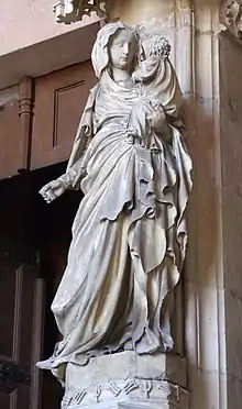 Jean de Marville created an important school of sculpture. Claus Sluter was the most noted member.[3] Sluter's nephew Claus de Werve was another member of this school.[4] Lesser sculptors of this school were Jehan de la Huerta and Antoine le Moiturier.[5] Claus Sluter (c.1360 - 1405), a sculptor from Harlem in the Netherlands, joined Jean de Marville's studio in 1383. At that time de Marville was directing the construction and decoration of the Chartreuse of Champanol, which was to be the Duke's burial place.[6] The image of the virgin and child in the center pillar of the monastery's chapel is attributed to either Marville or Sluter.