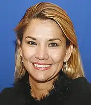 Jeanine Áñez Chávez (Spanish pronunciation: [ɟʝeˈnine ˈaɲes ˈtʃaβes] ; born 13 June 1967) is a Bolivian lawyer, politician, and television presenter who served as the 66th president of Bolivia from 2019 to 2020. A former member of the Social Democratic Movement, she previously served two terms as senator for Beni from 2015 to 2019 on behalf of the Democratic Unity coalition and from 2010 to 2014 on behalf of the National Convergence alliance. During this time, she served as second vice president of the Senate from 2015 to 2016 and in 2019 and, briefly, was president of the Senate, also in 2019. Before that, she served as a uninominal member of the Constituent Assembly from Beni, representing circumscription 61 from 2006 to 2007 on behalf of the Social Democratic Power alliance.