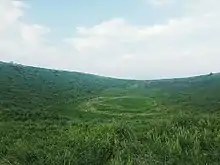 Yongnunioreum (Hangul: 용눈이오름) is located in Jongdal-ri Gujwa-eup Jeju-si.[12] The top of Yongnunioreum is composed of three peaks around the top of north-east direction, and there is an elliptical crater that is somewhat opened in the east–west direction. Overall, the shape of the mountain is a horseshoe-shaped crater that spreads shallowly toward the east slope. At the foot of the west slope, there is a small parasitic volcano with a marginated top and two conical parasitic volcanoes, Aloreum, and it is recorded as a complex Oreum, formed with two or more craters along with Yongnunioreum (Hangul: 용눈이오름) and Donurioreum (Hangul: 도너리오름). Especially, a complex volcano made up of various craters is known as an unusual shape.[12] It is said that it is called Oreum because of the shape of Oreum, the figure of the dragons playing, lying and rising in regard to the origin of the place name.[13]