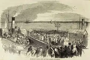 The Atlantic docked in New York on 1 September 1850. The following day, The New York Herald reported on "the spectacle of some thirty or forty thousand persons congregated on all the adjacent piers. ... From all quarters, crowds ... could be seen hurrying down towards the Atlantic's dock." So great was people's desire for a glimpse of the star that several people were "severely bruised, some came off with bloody noses, and two boys, about twelve years of age, appeared to be seriously injured. Had not the rush been checked in time, many lives would have been lost."[10] When she set foot on American soil, Lind kissed her hand to the U.S. flag and exclaimed, "There is the beautiful standard of freedom, which is worshipped by the oppressed of all nations."[8] She further endeared herself to the welcoming crowd by stopping Barnum's coachman from clearing a path through the throng with his whip.[8]