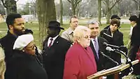 Jackson was arrested on his twenty-first birthday in Washington, D.C., following his participation in demonstrations against apartheid at the South African Embassy.[29][30] He had been arrested with his father and brother the year before in a similar activity.[31] His protest against apartheid extended to weekly demonstrations in front of the South African Consulate in Chicago. Jackson shared the stage with Nelson Mandela when Mandela made his historic speech following his release from a 27-year imprisonment in Cape Town in February 1990.[18] Before entering the House, he became secretary of the Democratic National Committee's Black Caucus, the national field director of the National Rainbow Coalition and a member of the Rainbow/PUSH Coalition.[19] Jackson served as the national field director of the Rainbow Coalition from 1993 to 1995.[32] Under Jackson's leadership, the Rainbow Coalition attempted to stimulate equitable hiring in the National Basketball Association because while 78% of the league's players were African American, 92% of the front-office executive positions, 88% of the administrative jobs, and 85% of the support positions were held by whites.[33] While serving as the field director for the National Rainbow Coalition, he helped register millions of new voters through a newly instituted national non-partisan program. He also created a voter education program to teach citizens the importance of participating in the political process.[18] He was a member of the Congressional Black Caucus, and also a founding board member of the Apollo Alliance.