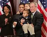 Left: United States President George W. Bush signing bill for Rosa Parks statue at Statuary Hall, (standing left to right) Richard Lugar, Alphonso Jackson, Laura Bush, Condoleezza Rice, Jackson, John Kerry, Thad Cochran; Right: Jackson, his children (Jesse III and Jessica), Bush, Rice (both images December 2005)