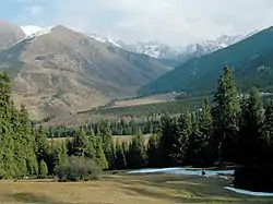 In the mountains surrounding Jeti-Ögüz, with visible pine-tree plantations
