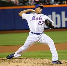 Familia became the established eighth inning pitcher, or the "set-up man" in front of the closer, Jenrry Mejia, in 2014.[18] When Mejia was suspended early in the 2015 season, Familia became the Mets' closer.[19][20] Familia made it to the final vote of the 2015 Major League Baseball All-Star Game but lost to Carlos Martinez. Familia struggled after the All-Star break, blowing three consecutive saves in late July, including giving up a game-winning home run to Justin Upton on July 30, 2015, when the Mets blew a six-run lead.[21] In the following weeks, however, he dramatically turned things around with 16 consecutive scoreless innings, zero earned runs, and eight converted saves in eight opportunities.[22]